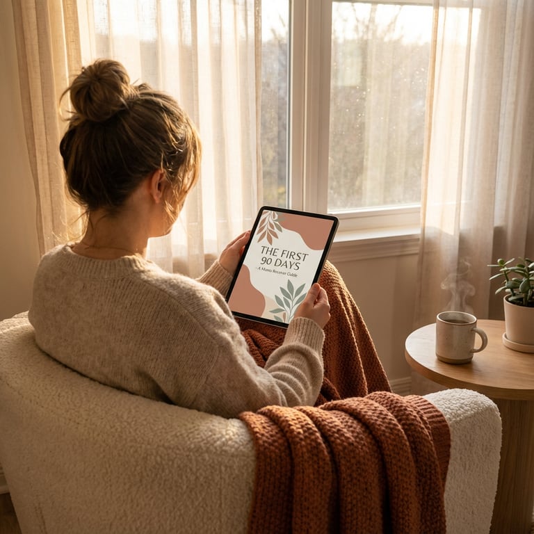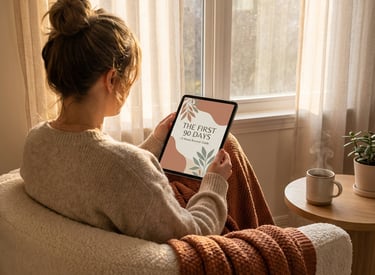 Simple: Purchase the guide, receive instant download links to your email, and access your PDF files immediately. You can read on your phone, tablet, computer, or print at home. The guide is structured week-by-week (Days 1-90), so you can start wherever you are in your postpartum journey—or read it all during pregnancy to prepare.